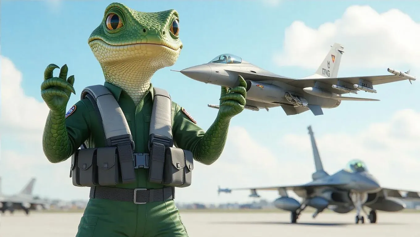A 3D lizard in a pilot's uniform, standing upright on two legs, holding a small model fighter jet, surrounded by a bright sky and military airbase, exuding stealth and excitement, with a confident expression and a hint of playful ambition.