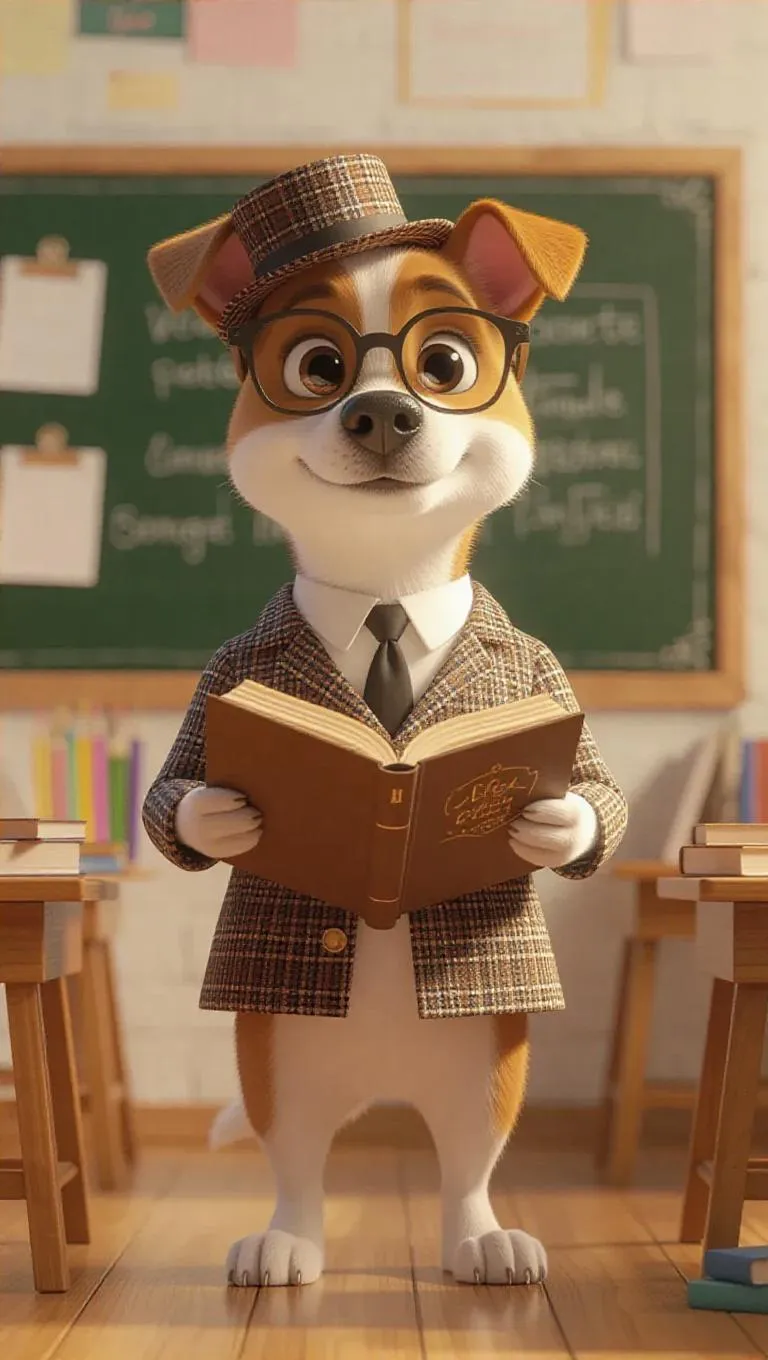 A 3D dog in a teacher's outfit and glasses, standing upright on two legs, holding a book, surrounded by a chalkboard and desks, exuding a knowledgeable and nurturing atmosphere, with a warm, inviting classroom setting and soft, ambient lighting.