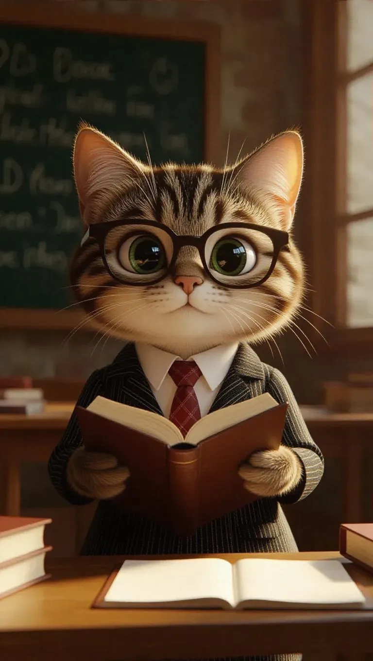 A 3D cat in a teacher's outfit and glasses, sitting down, holding a book, surrounded by a chalkboard and desks, exuding a knowledgeable and nurturing atmosphere, with a warm, inviting classroom setting and soft, ambient lighting.