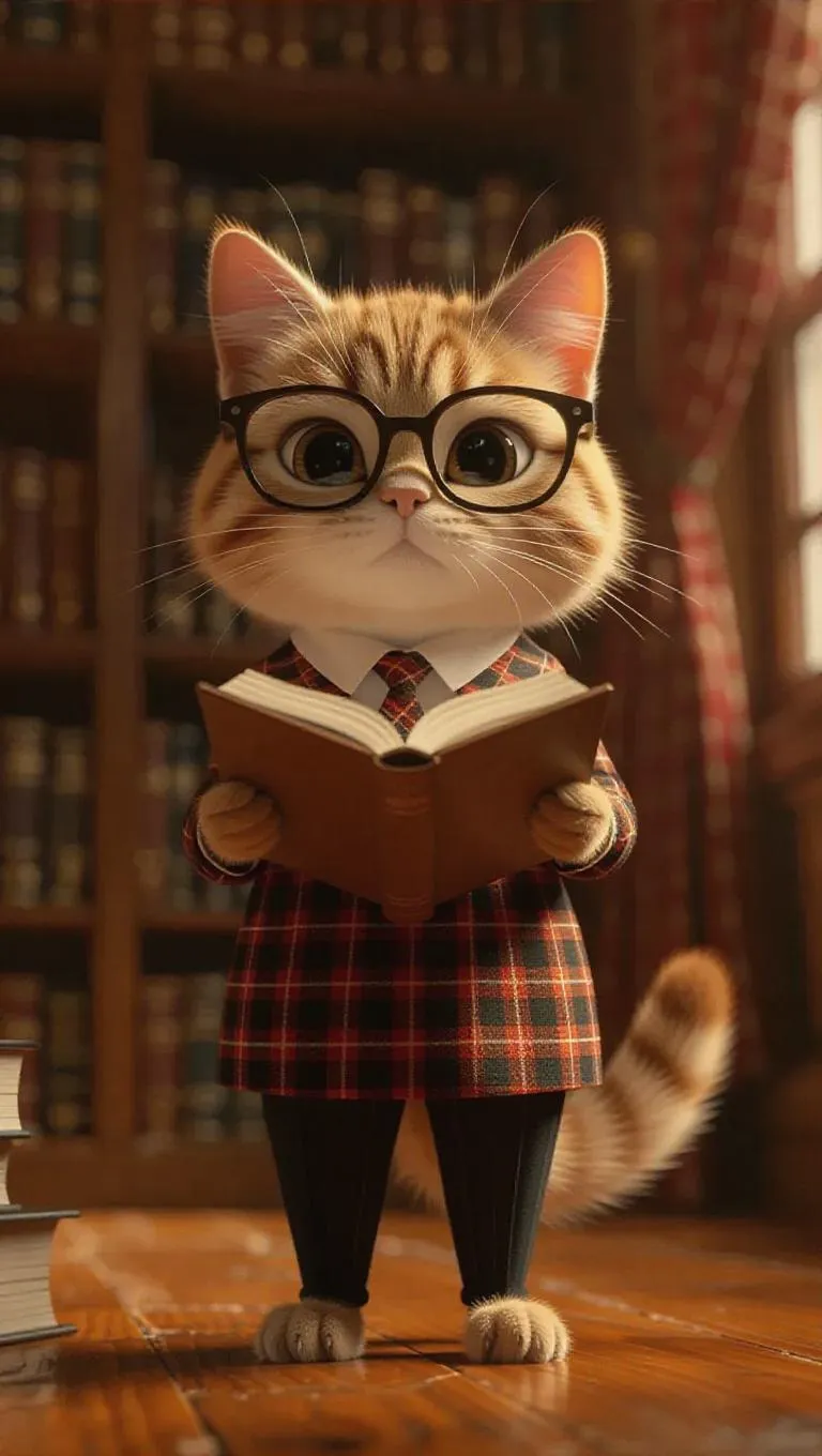 A 3D cat in a teacher's outfit and glasses, standing upright on two legs, holding a book, surrounded by a library and shelves, exuding a knowledgeable and nurturing atmosphere, with a warm, inviting classroom setting and soft, ambient lighting.