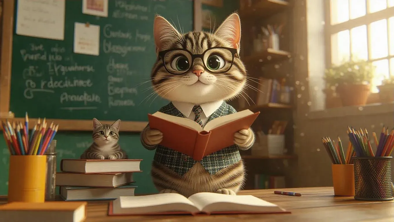 A 3D cat in a teacher's outfit and glasses, standing upright on two legs, holding a book, surrounded by a chalkboard and art supplies, exuding a knowledgeable and creative atmosphere, with a warm, inviting classroom setting and soft, ambient lighting.