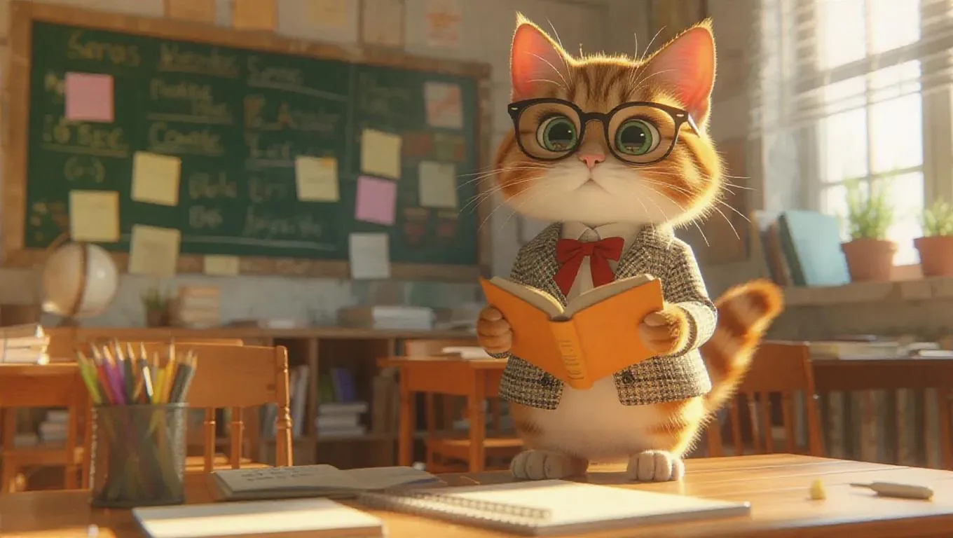 A 3D cat in a teacher's outfit and glasses, standing upright on two legs, holding a book, surrounded by a digital whiteboard and desks, exuding a knowledgeable and modern atmosphere, with a warm, inviting classroom setting and soft, ambient lighting.