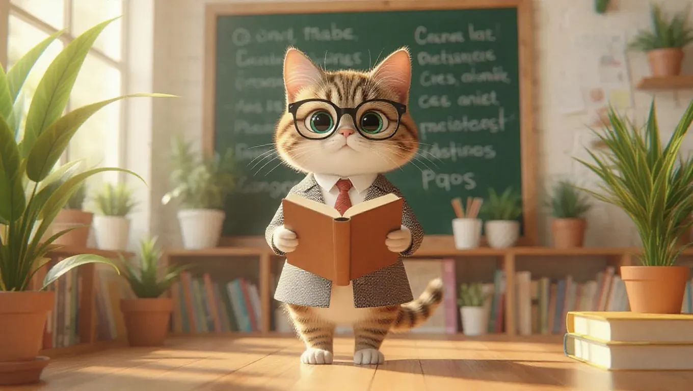 A 3D cat in a teacher's outfit and glasses, standing upright on two legs, holding a book, surrounded by a chalkboard and plants, exuding a calm and nurturing atmosphere, with a warm, inviting classroom setting and soft, ambient lighting.