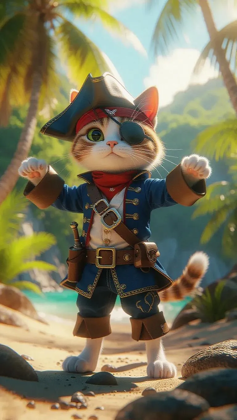 A 3D cat wearing a pirate outfit and eye patch, standing upright on two legs like a human, striking a dynamic swashbuckling pose, surrounded by a tropical island, bathed in bright sunlight, exuding a fun and adventurous atmosphere.