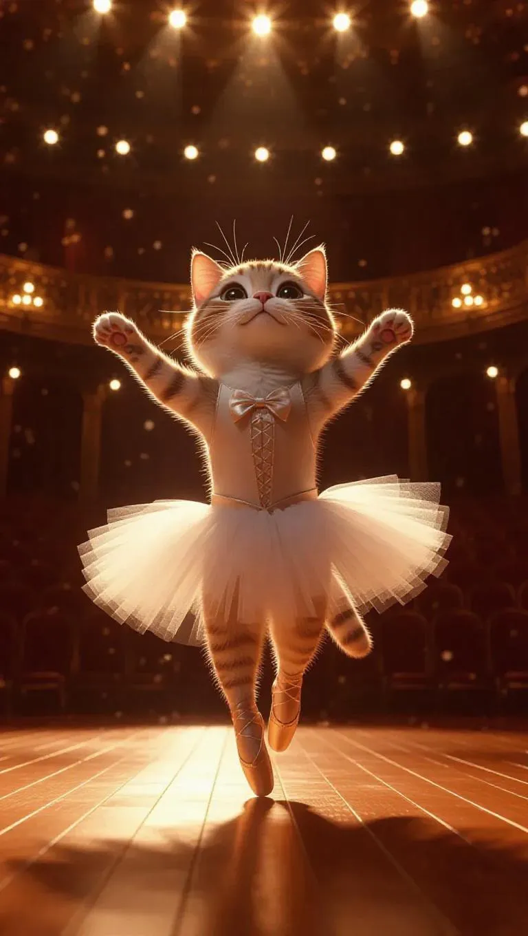 A 3D cat wearing a graceful ballet tutu and slippers, standing upright on two legs like a human, striking a dynamic dance pose, surrounded by a grand theater stage, bathed in soft spotlights, exuding a sophisticated and artistic atmosphere.