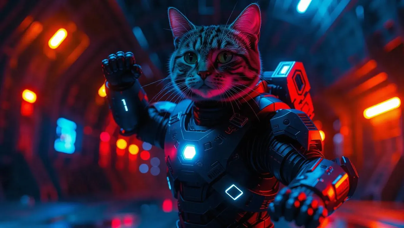 A 3D cat wearing a futuristic exosuit, standing upright on two legs like a human, striking a dynamic power pose, surrounded by a sci-fi landscape, bathed in ambient lighting, exuding a bold and thrilling atmosphere.