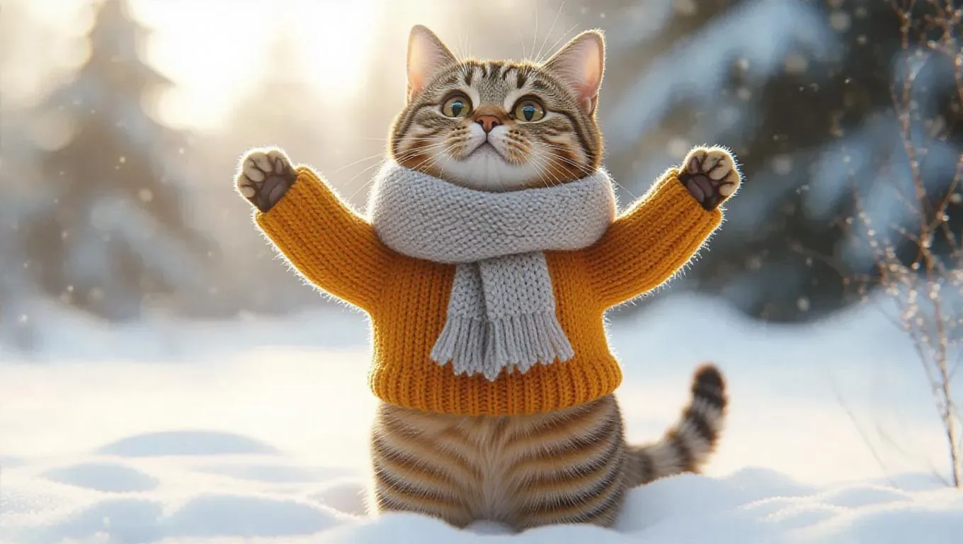 A 3D cat wearing a cozy sweater and scarf, standing upright on two legs like a human, striking a dynamic relaxed pose, surrounded by a snowy landscape, bathed in soft morning light, exuding a warm and cozy atmosphere.
