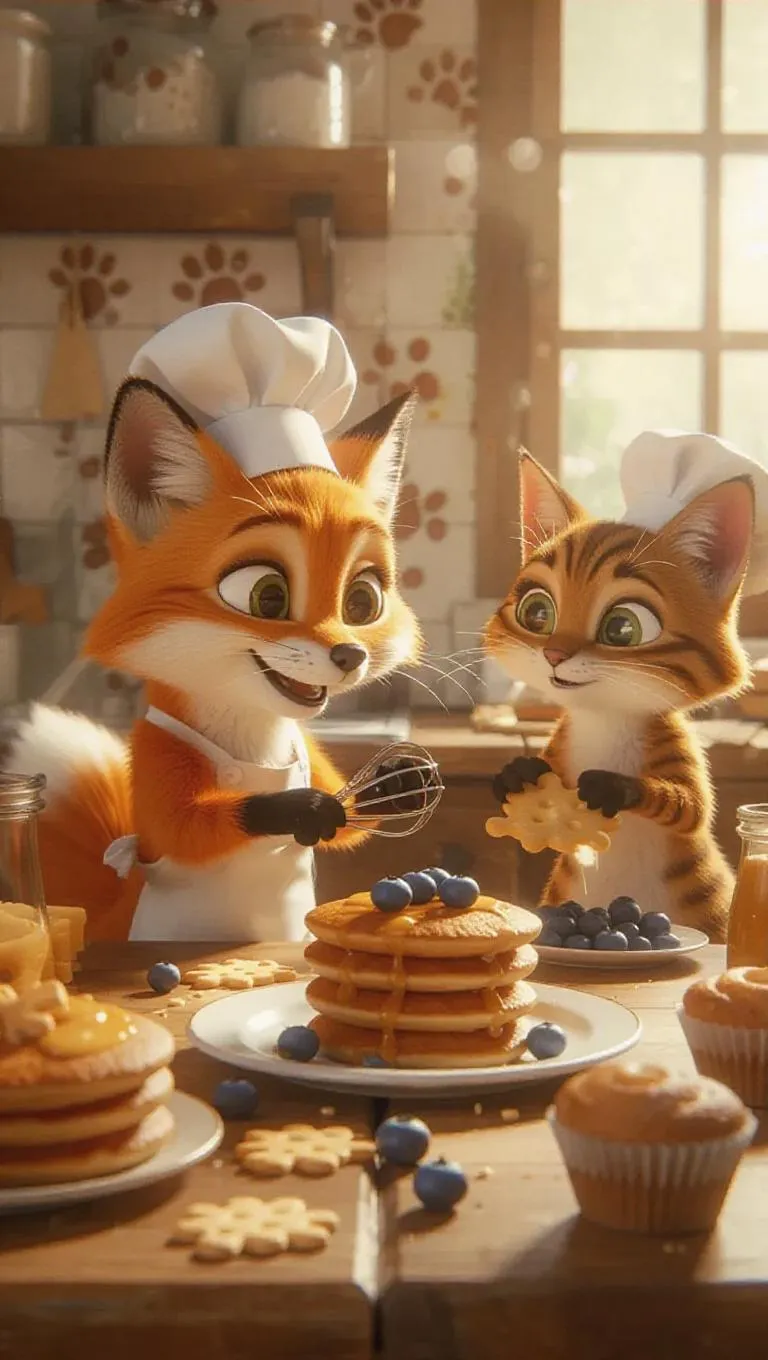 Animal chefs in a cozy, messy kitchen. Fox wearing a stylish chef hat, whisking rich peanut butter banana batter. Paw-print tiles, soft natural light streaming in. Cat grating cheese with a playful look, bird dropping plump blueberries. Paw-shaped pancakes, cheesy crackers, blueberry muffins. Warm, joyful, delicious, humorous mood.