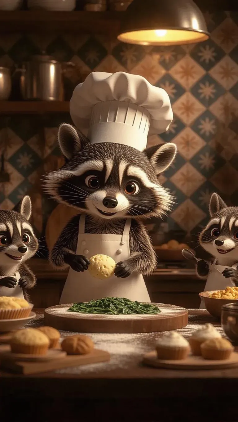 Animal chefs in a charming, busy kitchen. Raccoon wearing an elaborate chef hat, folding savory spinach dough. Star-patterned tiles, soft evening light filtering in. Fox chopping nuts with a mischievous gaze, chipmunk tossing flour. Critter-shaped cakes, herb crackers, tropical muffins. Casual, whimsical, rich, delightful mood.