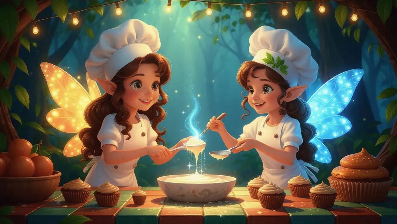 Animal chefs in an enchanted forest kitchen. Fairy wearing a whimsical chef hat, stirring magical nectar batter. Leaf-patterned tiles, twinkling fairy lights illuminating. Pixie grating fruits with a delighted expression, sprite sprinkling fairy dust. Fantasy-themed cookies, herbal bites, sparkling muffins. Enchanted, playful, delightful, whimsical mood.