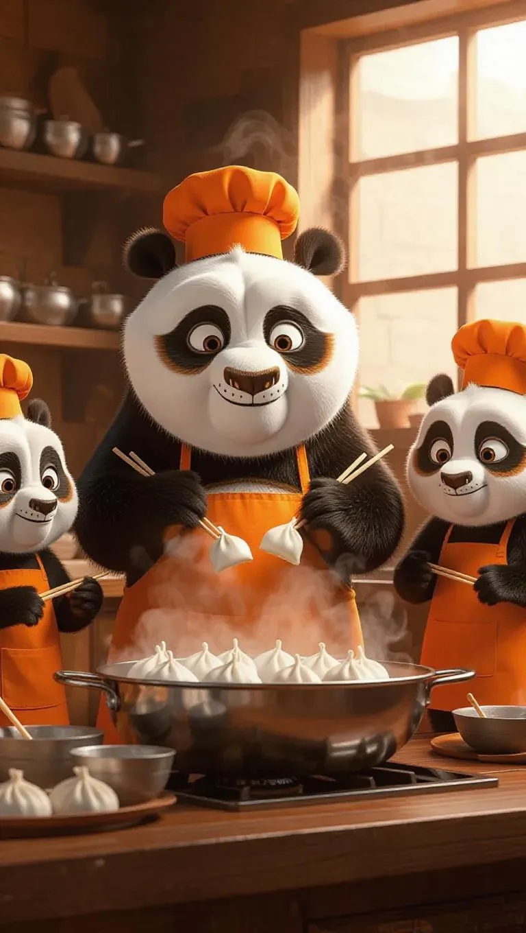 4x image of a cartoonish panda in an orange apron and chef cap, cooking momos in a steaming hot pot in a cozy, bright, jungle-type kitchen. Baby pandas, also in orange aprons and chef caps, hold chopsticks and sit on the counter, eagerly watching the big panda.