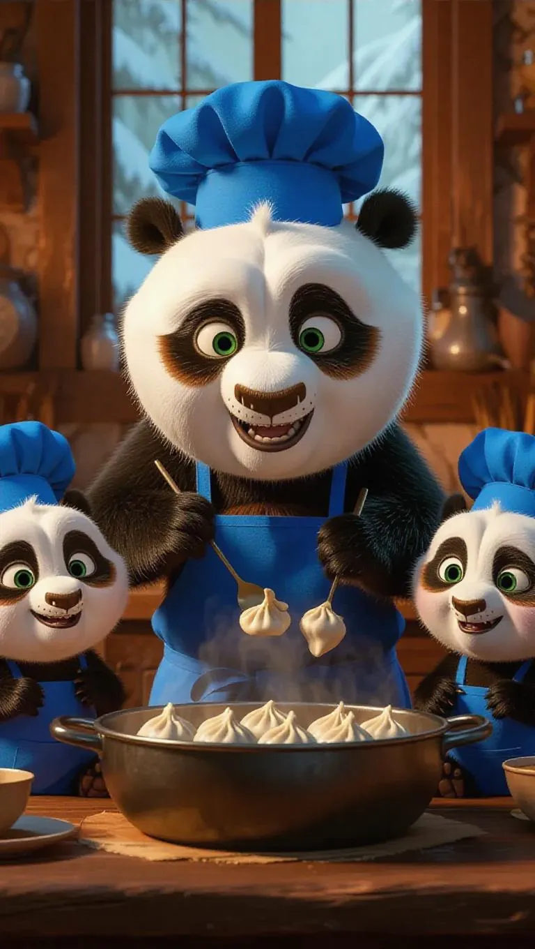1. 4x image of a cartoonish panda in a blue apron and chef cap, cooking dumplings in a sizzling hot pot in a cozy, bright, forest-type kitchen. Baby pandas, also in blue aprons and chef caps, hold spoons and sit on the counter, eagerly watching the big panda.