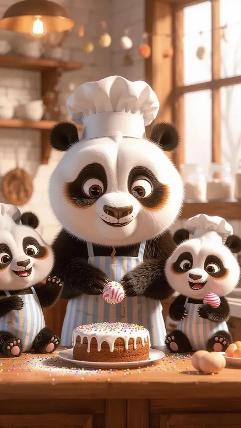 9. 4x image of a cartoonish panda in a striped apron and chef cap, baking a cake in a cozy, bright, bakery-type kitchen. Baby pandas, also in striped aprons and chef caps, hold sprinkles and sit on the counter, eagerly watching the big panda.
