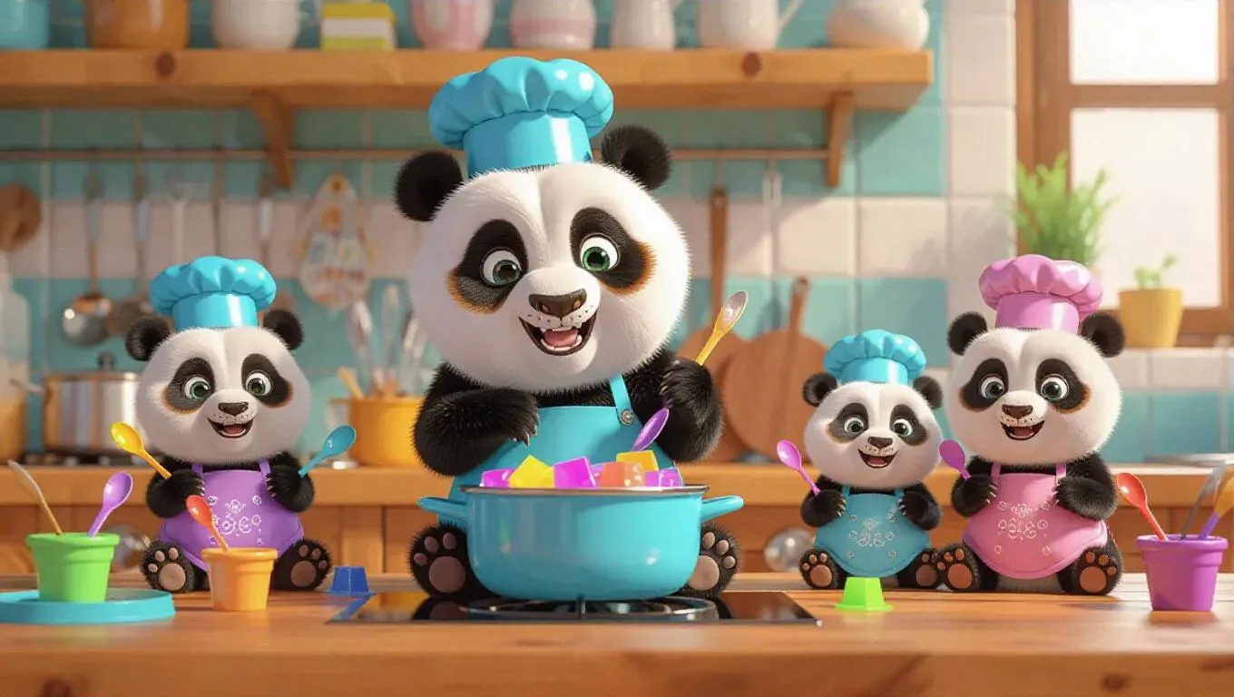 17. 4x image of a cartoonish panda in a whimsical apron and chef cap, making jello in a playful hot pot in a cozy, colorful, children's kitchen. Baby pandas, also in whimsical aprons and chef caps, hold colorful spoons and sit on the counter, eagerly watching the big panda.