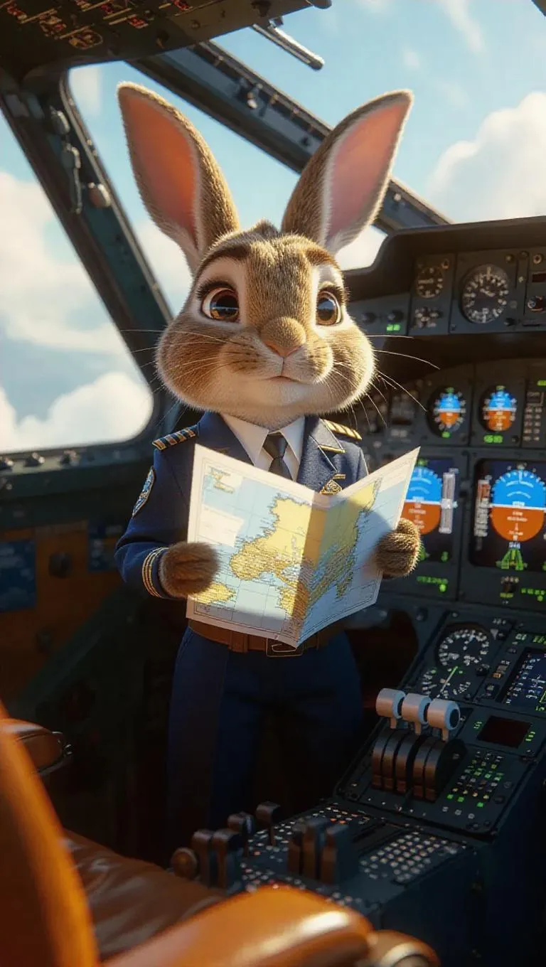 A 3D bunny in a crisp pilot's uniform, standing upright on two legs, confidently holding a detailed flight map. Surrounded by a modern cockpit with gleaming instruments, the bunny gazes out at a vast, sunny sky, exuding an adventurous and daring spirit.