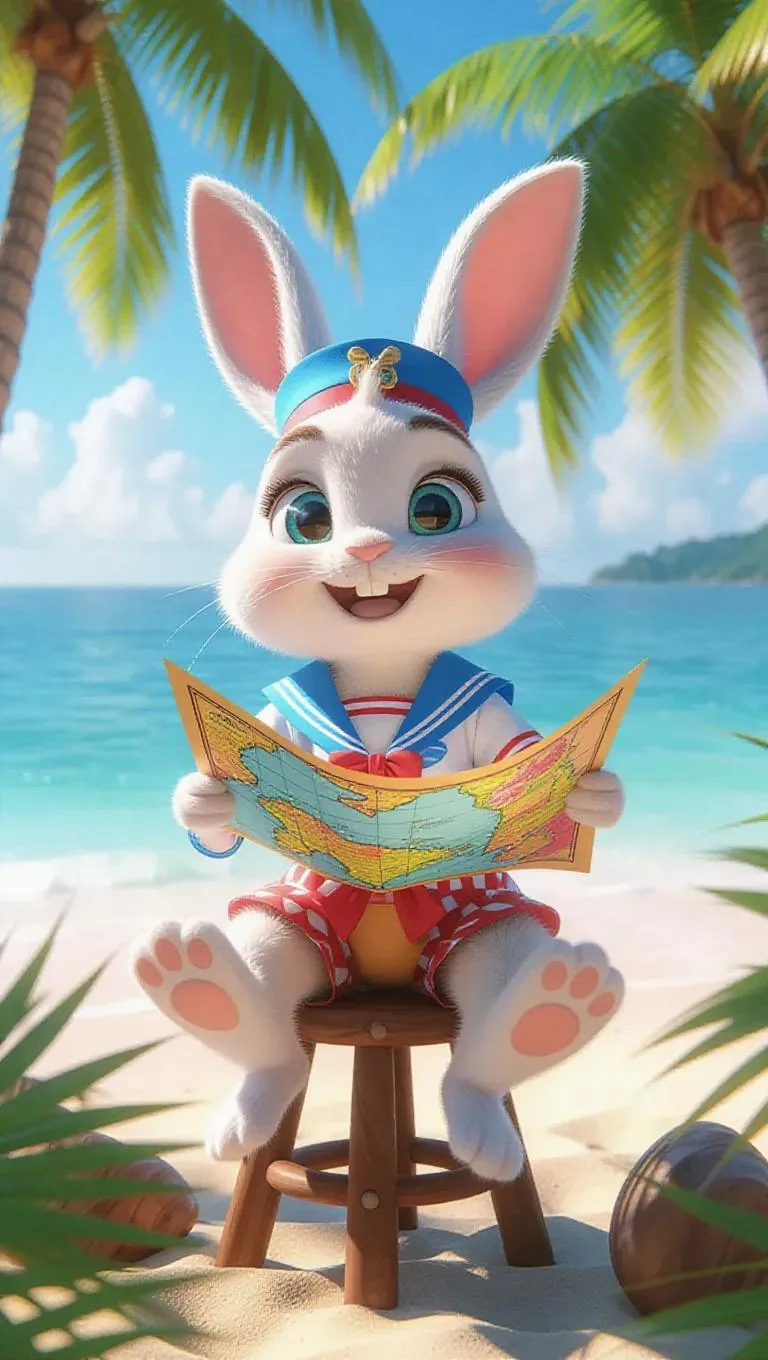 A 3D bunny in a colorful sailor's outfit, sitting on a stool, cheerfully holding a treasure map. Surrounded by a tropical beach with swaying palm trees, the bunny gazes out at a sparkling ocean, exuding a playful and adventurous spirit.