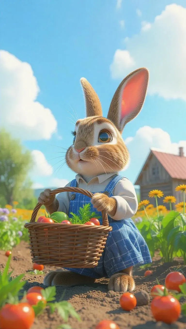 A 3D bunny in a rustic farmer's attire, squatting in a field, carefully holding a basket of fresh vegetables. Surrounded by a sunny farm landscape with blooming flowers, the bunny gazes out at a clear blue sky, exuding a peaceful and nurturing spirit.