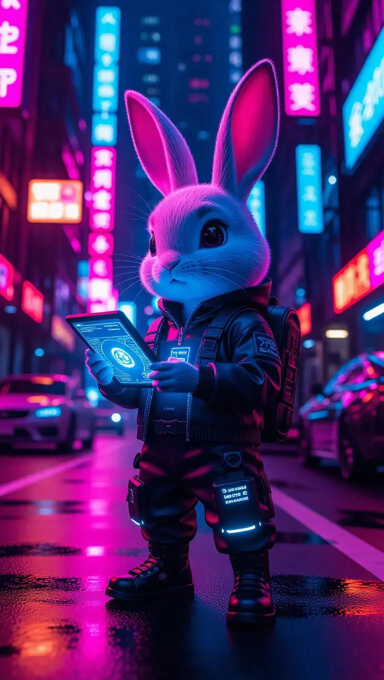 A 3D bunny in a futuristic cyberpunk outfit, standing on a neon-lit street, eagerly holding a holographic device. Surrounded by a high-tech urban environment with flying cars, the bunny gazes out at a vibrant nightlife, exuding a modern and adventurous spirit.