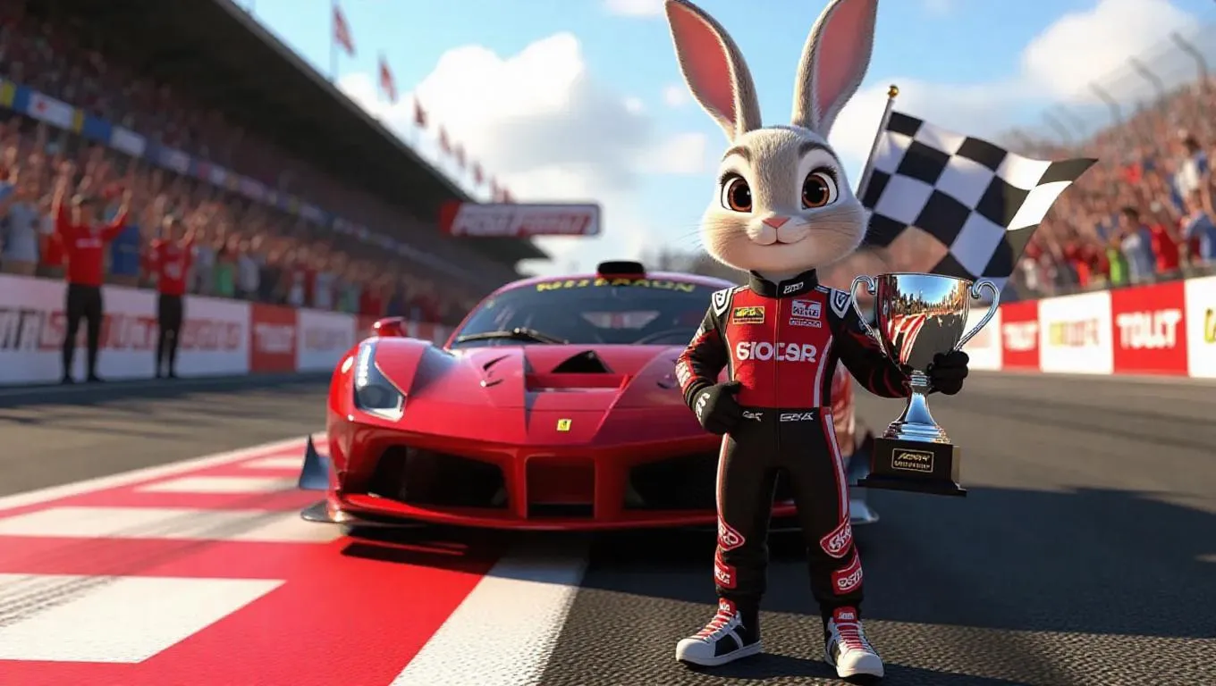 A 3D bunny in a sleek racing suit, confidently standing beside a sports car, proudly holding a trophy. Surrounded by a vibrant racetrack with cheering fans, the bunny gazes out at the checkered flag, exuding triumph and speed.