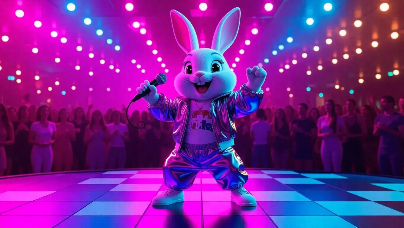 A 3D bunny in a retro 80s neon outfit, dancing on a disco floor, energetically holding a microphone. Surrounded by a lively nightclub filled with bright lights, the bunny gazes out at a packed dance floor, exuding fun and vibrancy.