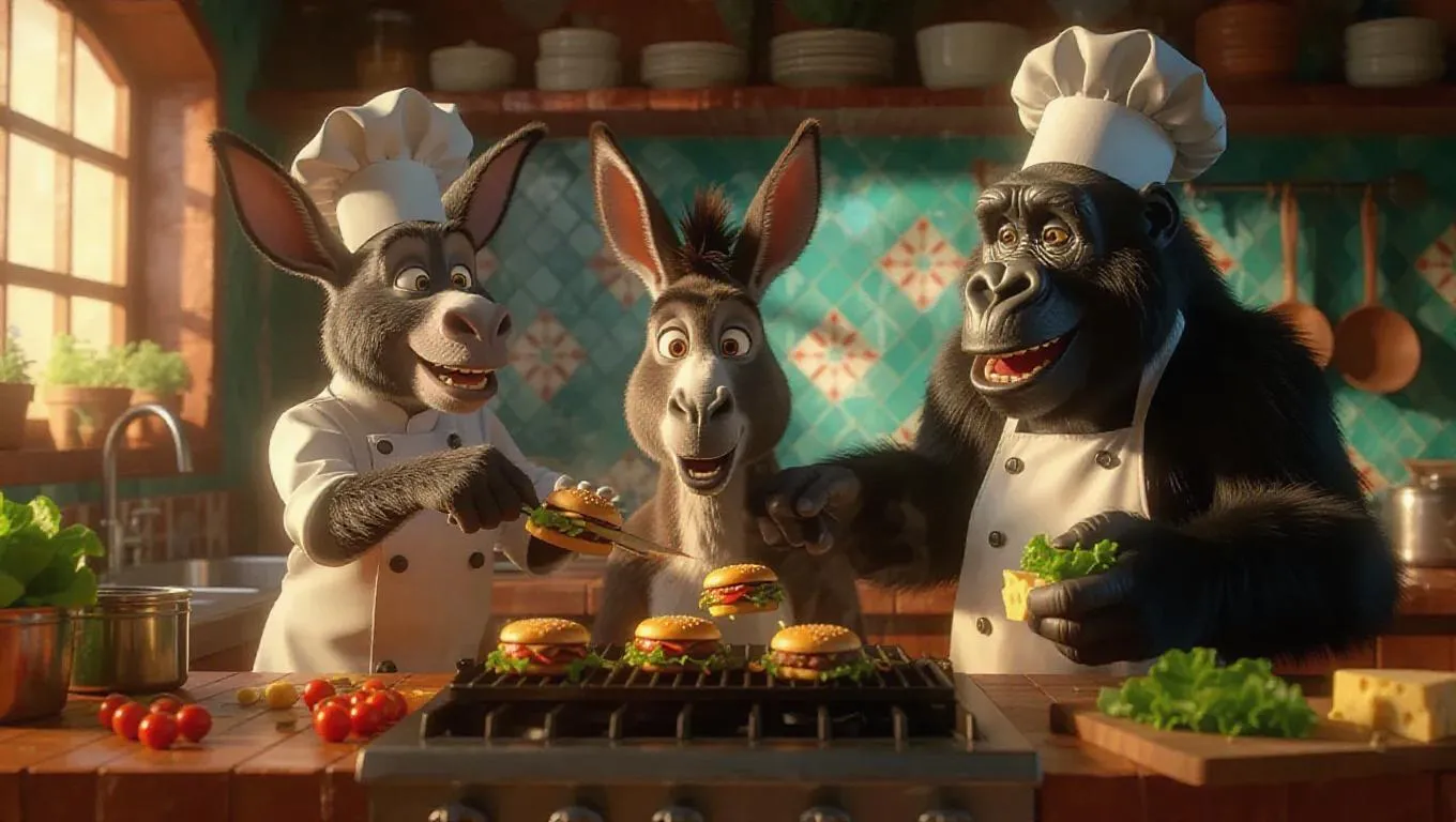 Animal chefs in a charming, artistic kitchen. Donkey in a chef hat flipping veggie burgers on a sizzling grill, paint-patterned tiles, colorful light streaming in. Gorilla slicing cheese, canary adding fresh lettuce. Paw-shaped wraps, cheese displays, lettuce bundles. Happy, lively, tasty, playful vibe.