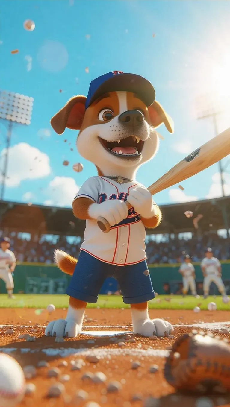 A 3D dog image, wearing a baseball cap and jersey, standing upright on two legs like a human, holding a baseball bat, surrounded by a baseball field and cheering fans, exuding an energetic and competitive atmosphere, with equipment scattered around and a bright midday sun in the background.