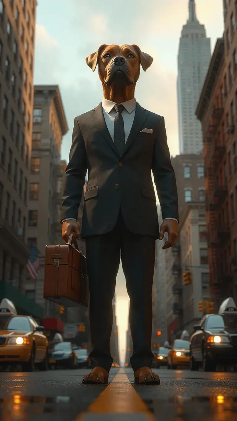 A 3D dog image, wearing a formal suit and tie, standing upright on two legs like a human, holding a briefcase, surrounded by skyscrapers and a bustling city street, exuding a professional and determined atmosphere, with cars scattered around and a cloudy sky in the background.