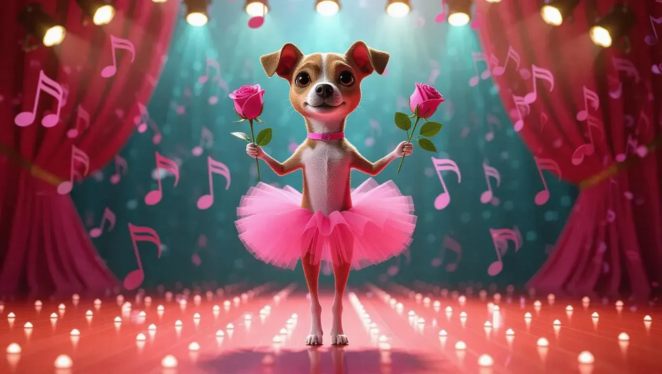 A 3D dog image, wearing a ballerina tutu and ballet slippers, standing upright on two legs like a human, holding a rose, surrounded by a stage and music notes, exuding a graceful and artistic atmosphere, with spotlight scattered around and a soft pink hue in the background.