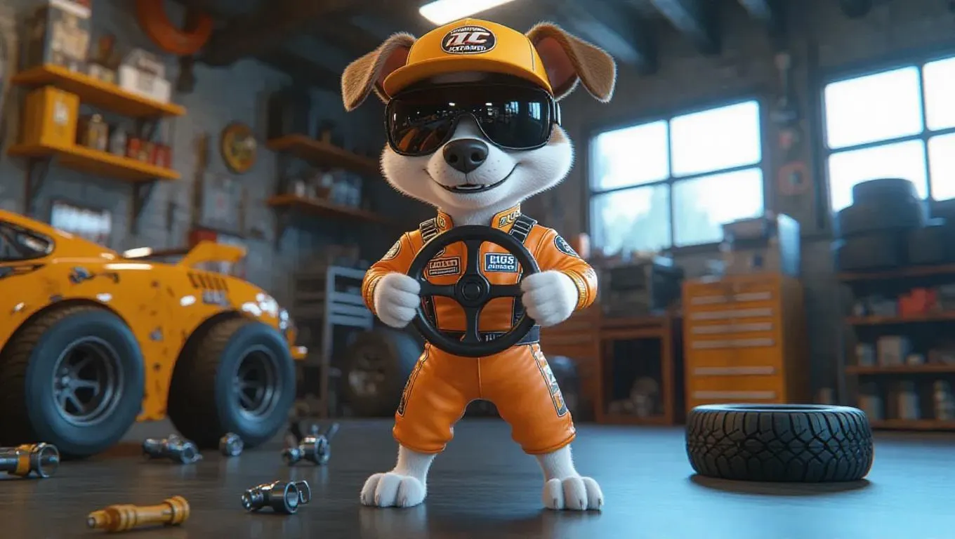 A 3D dog image, wearing a racing jumpsuit and visor, standing upright on two legs like a human, holding a steering wheel, surrounded by a garage and car parts, exuding a dynamic and energetic atmosphere, with tires scattered around and greased tools in the background.