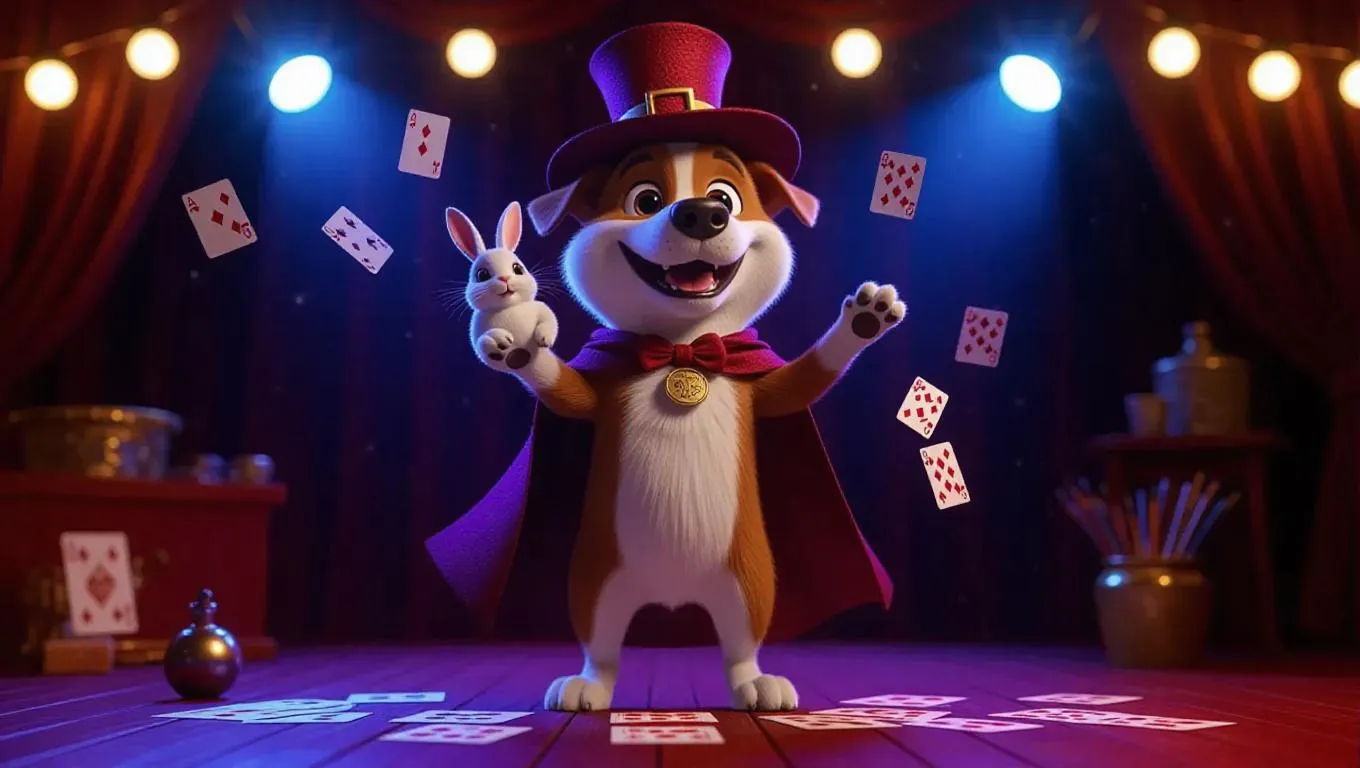 A 3D dog image, wearing a magician's hat and cape, standing upright on two legs like a human, holding a rabbit, surrounded by magic props and a stage, exuding a whimsical and magical atmosphere, with cards scattered around and bright lights in the background.
