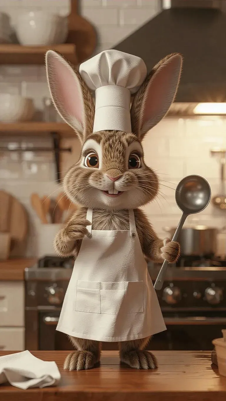 A 3D bunny wearing a chef's hat and apron, standing upright on two legs, holding a ladle with a cheerful expression. Surrounded by a kitchen counter and a stove, the scene exudes a warm and inviting atmosphere, with bright lighting and rustic kitchen decor.