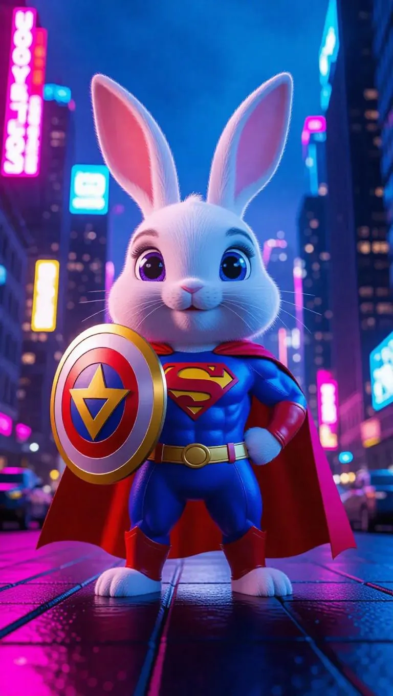 A 3D bunny in a superhero costume with a cape, standing upright on two legs, holding a logo-emblazoned shield with a confident expression. Surrounded by a city skyline and tall buildings, the scene exudes a powerful and heroic atmosphere, with vibrant lighting and urban decor.