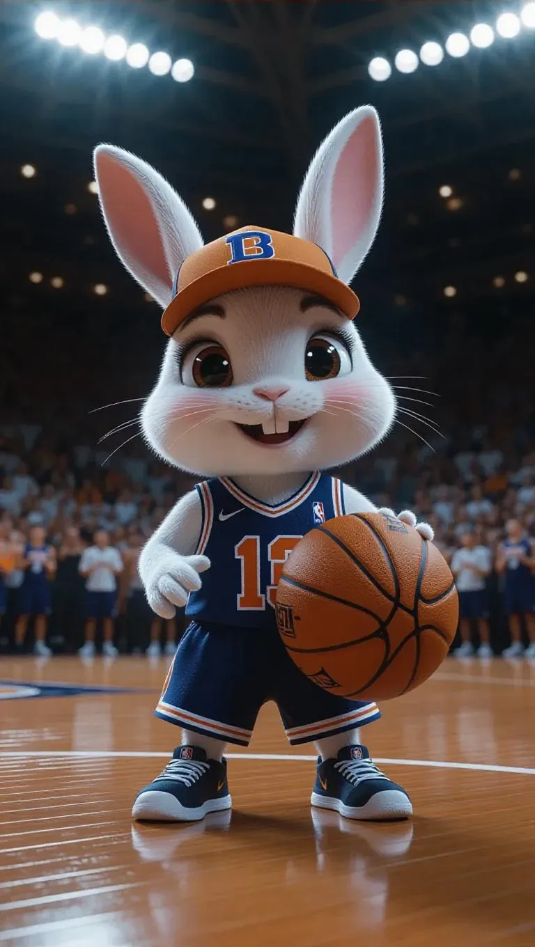 A 3D bunny dressed in a sports jersey and cap, standing upright on two legs, holding a basketball with an eager expression. Surrounded by a court and spectators, the scene exudes a spirited and competitive atmosphere, with energetic lighting and sports arena decor.
