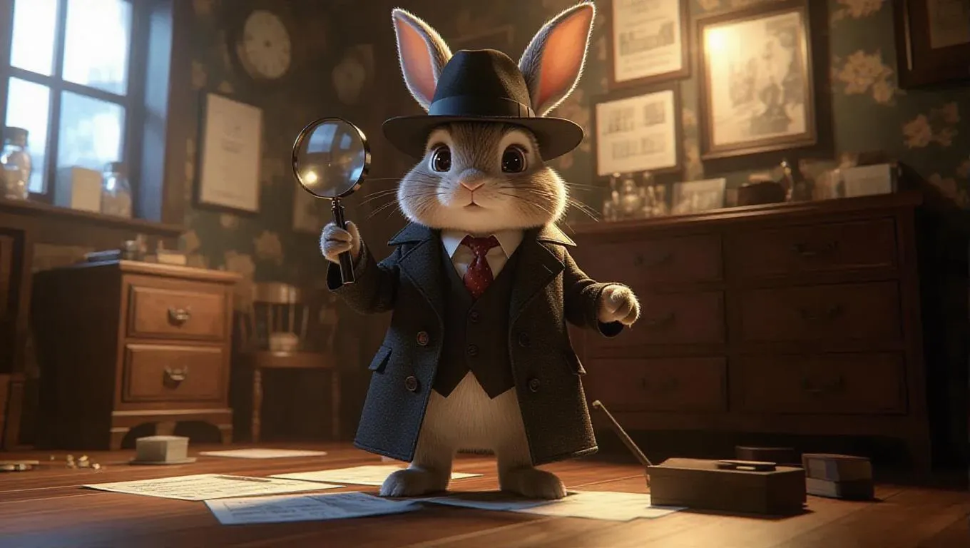 A 3D bunny in a detective's trench coat and fedora, standing upright on two legs, holding a magnifying glass with a curious expression. Surrounded by a crime scene and clues, the scene exudes a mysterious and intriguing atmosphere, with shadowy lighting and noir-themed decor.