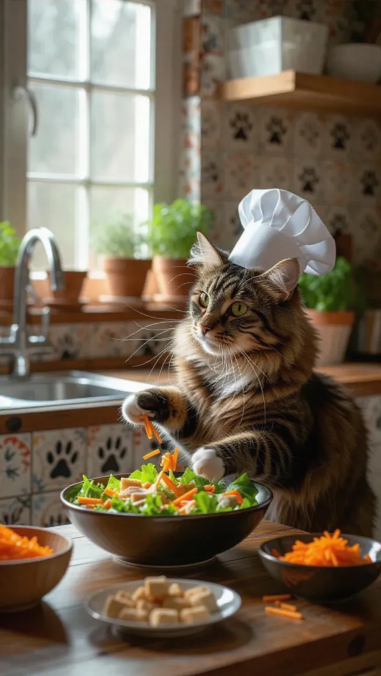 Animal chefs in a cozy, messy kitchen. Cat wearing a chef hat, tossing a fresh salad in a large bowl. Paw-print tiles, natural light streaming through windows. Dog grating carrots, bird dropping croutons. Paw-shaped salad bowls, carrot sticks, crouton baskets. Warm, joyful, delicious, humorous mood.