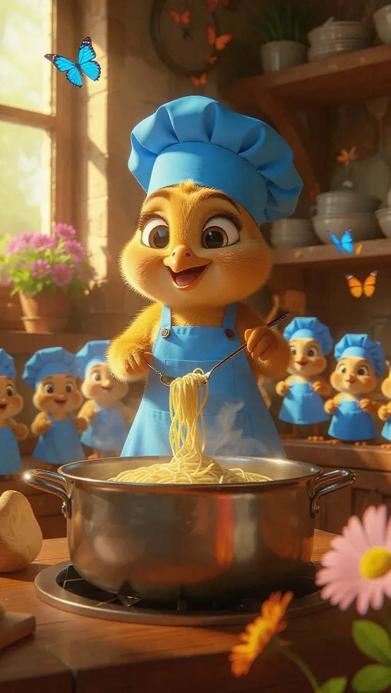 2. 4x image of a cartoonish hen wearing a blue apron and a blue chef cap, cooking noodles in a steaming hot pot in a cozy, sunny, garden-type kitchen. Many baby hens, also in blue aprons and chef caps, are playfully tossing noodles into the hot pot while perched on the kitchen counter, surrounded by blooming flowers and bright butterflies.