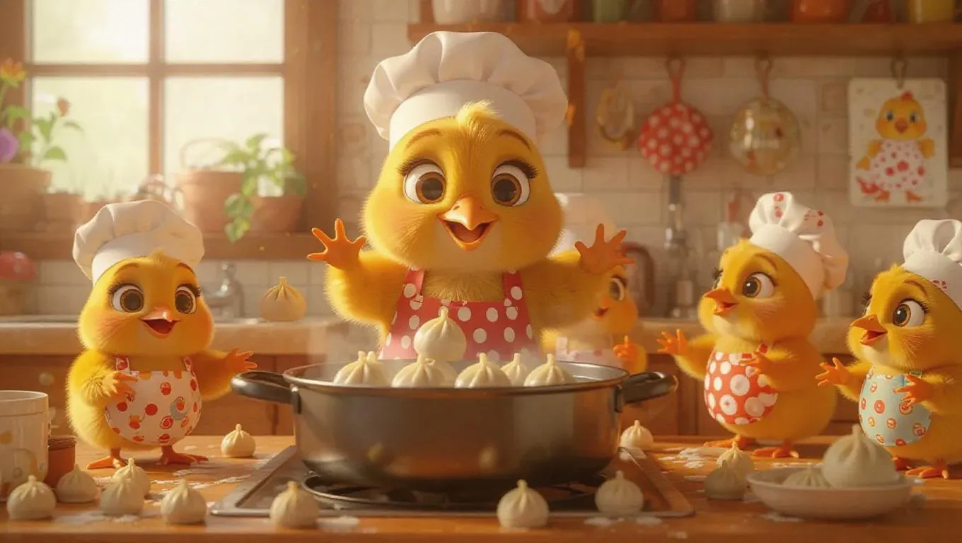 16. 4x image of a cartoonish hen wearing an apron with cartoon animals and a polka dot chef cap, cooking dumplings in a steaming hot pot in a cozy, bright, children’s kitchen. Many baby hens, also in animal-themed aprons and polka dot chef caps, are playfully tossing dumplings into the hot pot while perched on the kitchen counter, surrounded by educational toys and pictorial wall art.