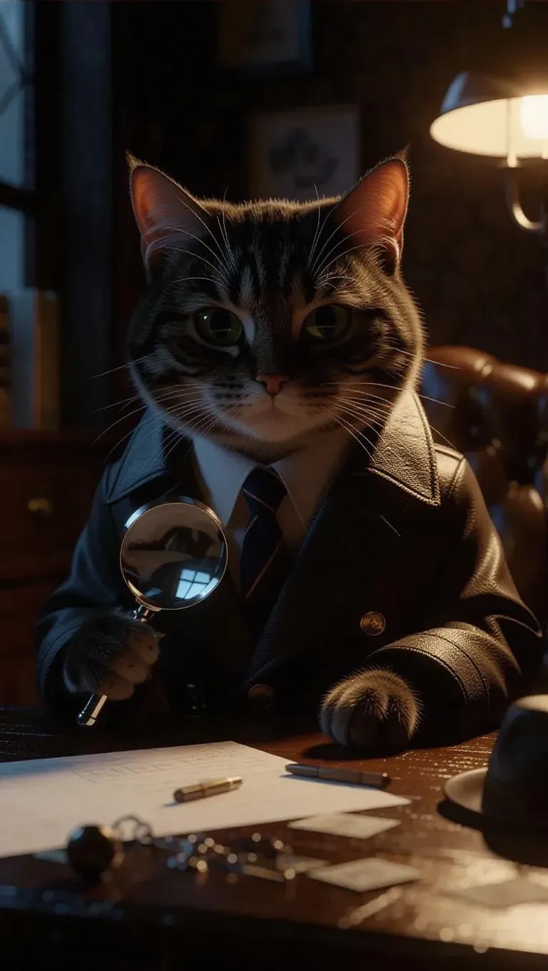 A 3D cat in a detective's trench coat, sitting at a desk, holding a magnifying glass, surrounded by clues and a dimly lit room, exuding a mysterious and intriguing ambiance, with shadowy light illuminating the scene, creating a suspenseful and noir setting.