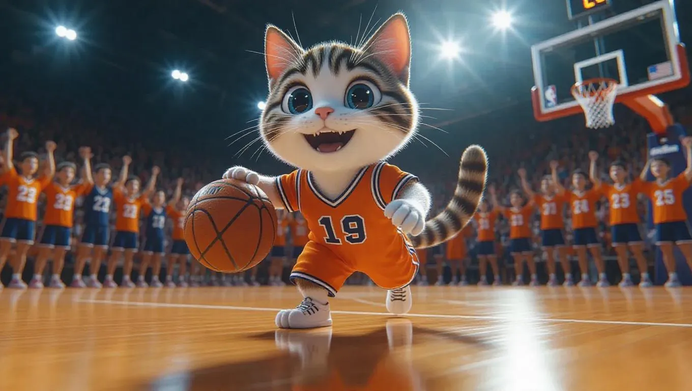 A 3D cat in a sports jersey, dribbling a basketball, surrounded by cheering fans and a basketball court, exuding an energetic and competitive ambiance, with dynamic light illuminating the scene, creating an exciting and lively setting.