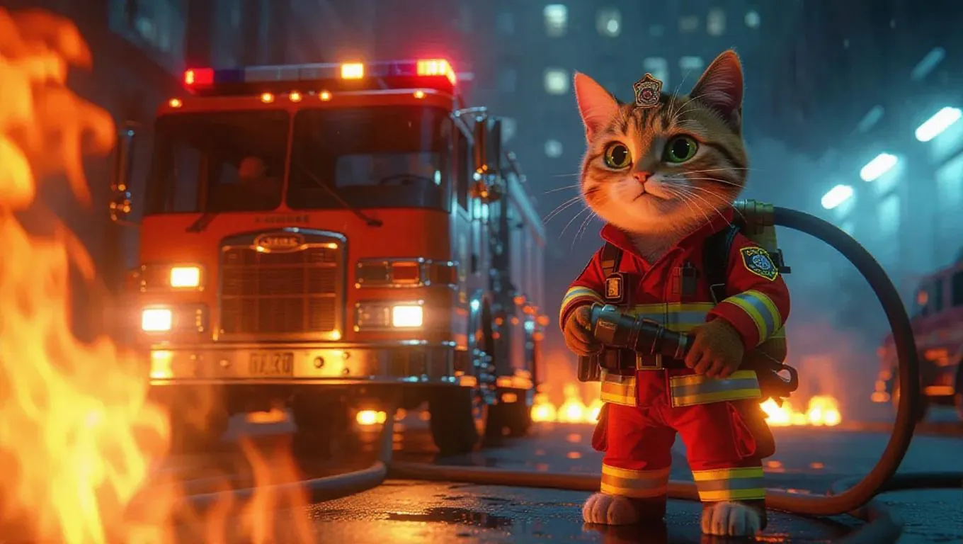 A 3D cat in a fireman's suit, standing beside a fire truck, holding a hose, surrounded by flames and smoke, exuding a heroic and urgent ambiance, with bright light illuminating the scene, creating a dramatic and intense setting.