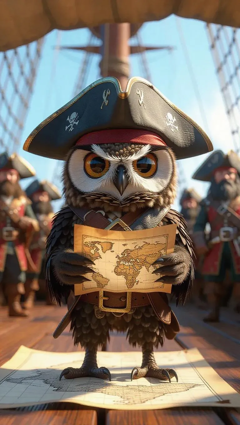 A 3D owl image dressed as a pirate with a tricorn hat and eyepatch, standing upright on two legs like a human, holding a treasure map, surrounded by a ship's deck full of adventurous crew members, exuding a swashbuckling and daring atmosphere.