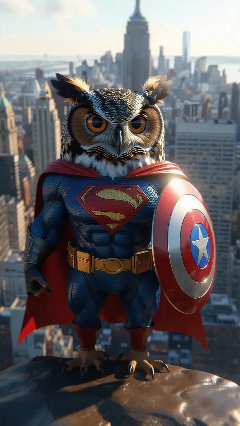 A 3D owl image wearing a superhero costume and mask, standing upright on two legs like a human, holding a shield, surrounded by a city skyline filled with vigilant citizens, exuding a heroic and inspiring atmosphere.