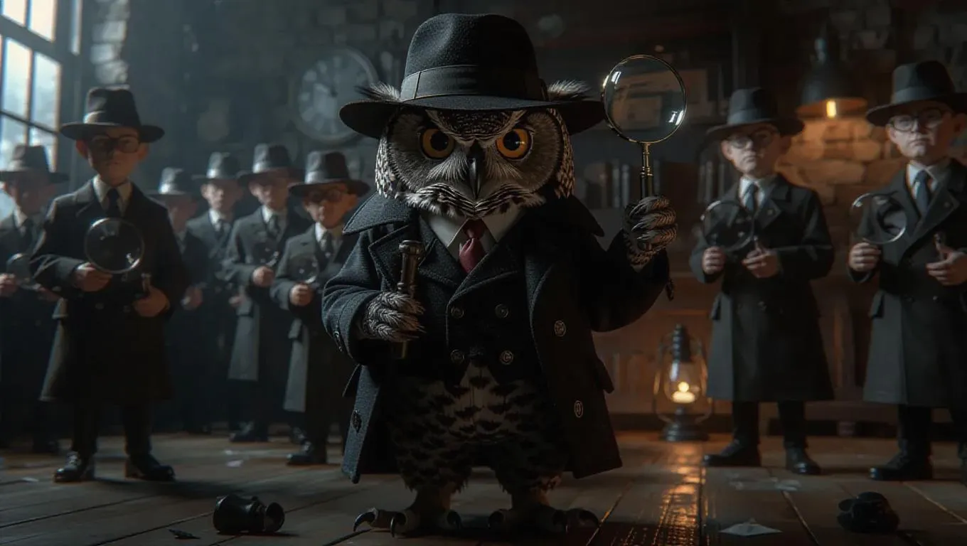 A 3D owl image dressed in a detective's trench coat and hat, standing upright on two legs like a human, holding a magnifying glass, surrounded by a crime scene filled with curious investigators, exuding a mysterious and suspenseful atmosphere.