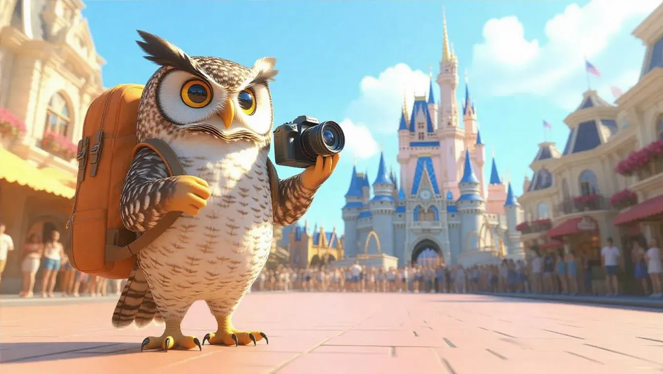 A 3D owl image wearing a traveler’s outfit and backpack, standing upright on two legs like a human, holding a camera, surrounded by a scenic landmark filled with excited tourists, exuding a vibrant and adventurous atmosphere.