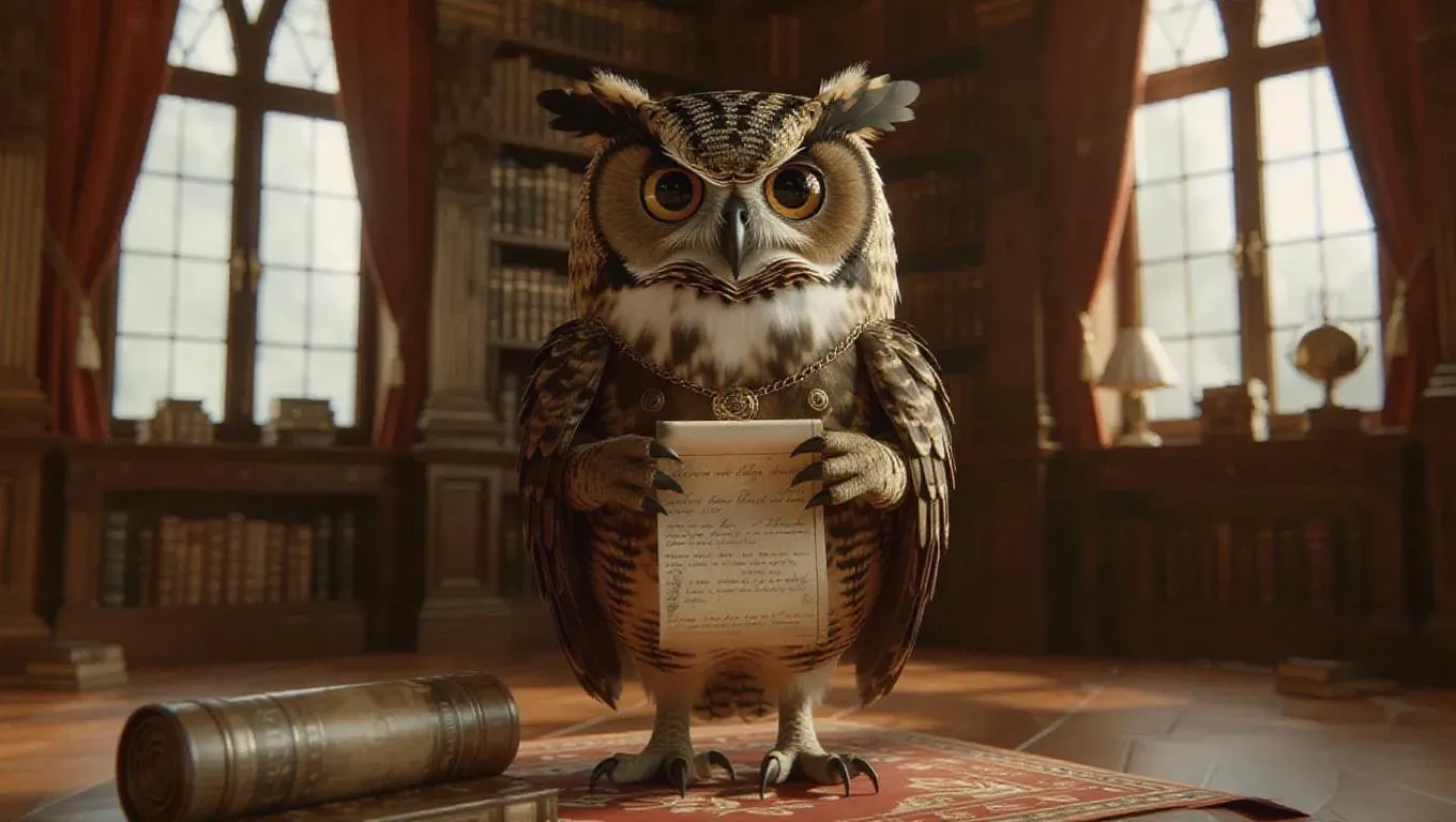 A 3D owl image dressed as a historian in period clothing, standing upright on two legs like a human, holding a scroll, surrounded by an antique library full of eager learners, exuding a scholarly and timeless atmosphere.