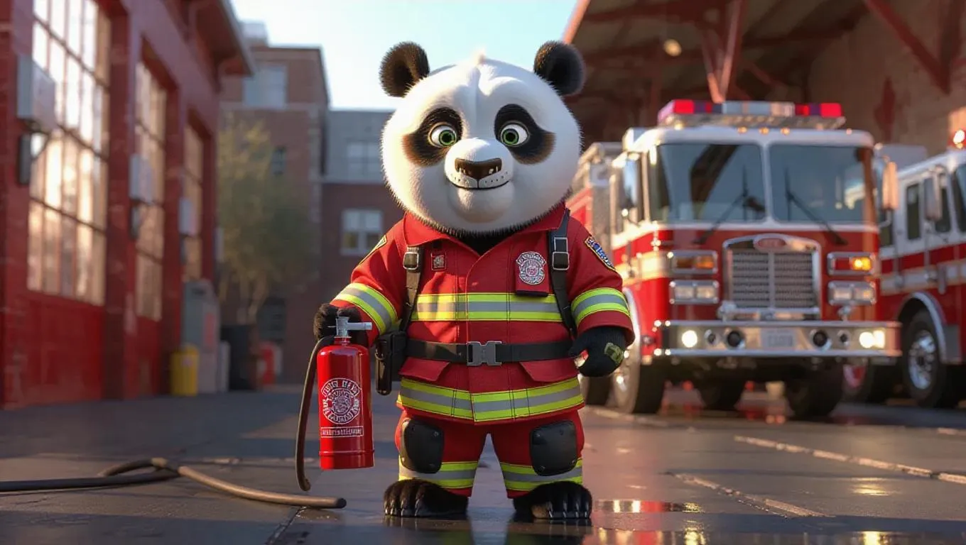 A 3D panda image wearing a firefighter's uniform, standing upright on two legs like a human, holding a fire extinguisher, surrounded by a fire station and a view of a fire truck, exuding a brave and heroic atmosphere.