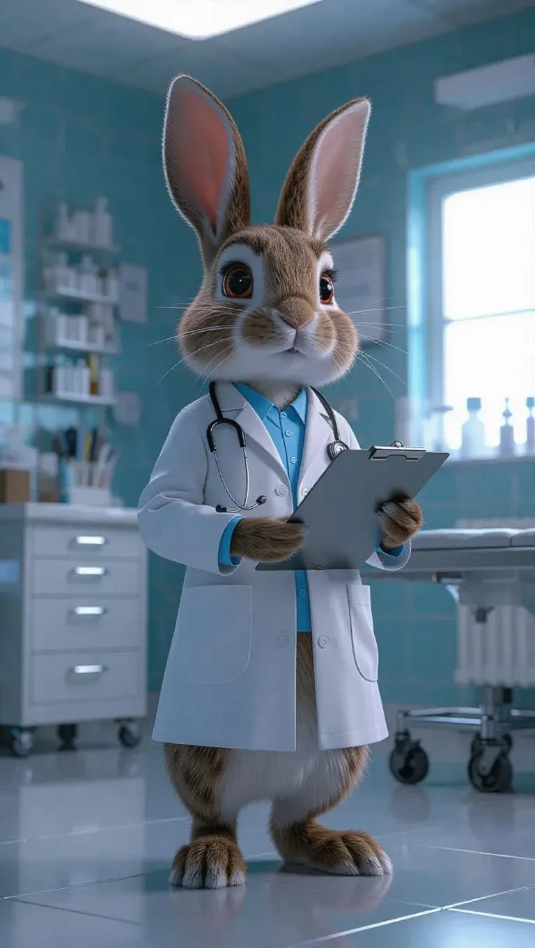 A 3D rabbit image wearing a crisp white doctor's coat and stethoscope, standing upright on two legs, holding a clipboard with a focused expression. Surrounded by a sleek medical cart and an examination table, the scene exudes a caring and professional atmosphere, with cool lighting and sterile decor.