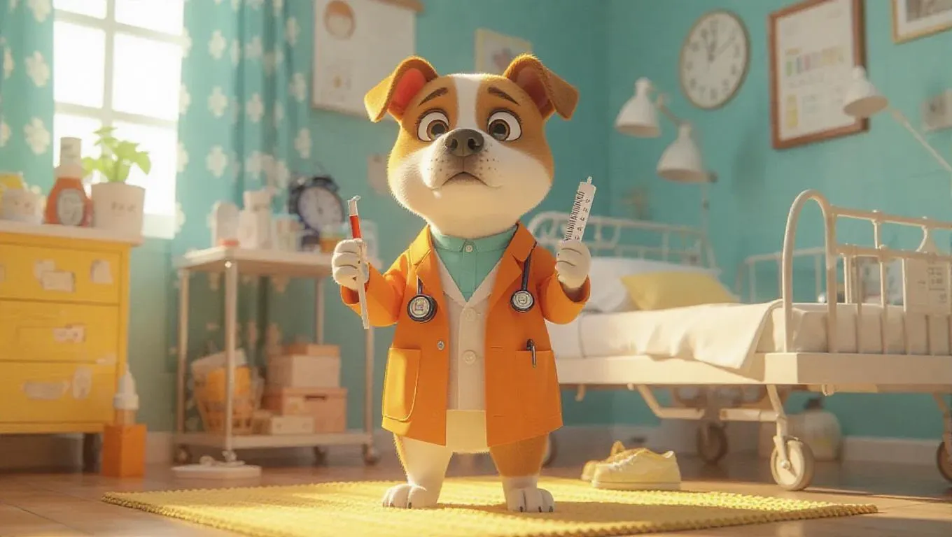 A 3D dog image wearing an orange doctor's coat, standing upright on two legs, holding a thermometer with a worried expression. Surrounded by a homey medical cart and a patient bed, the scene exudes a warm and inviting atmosphere, with soft yellow lighting and cozy decor.