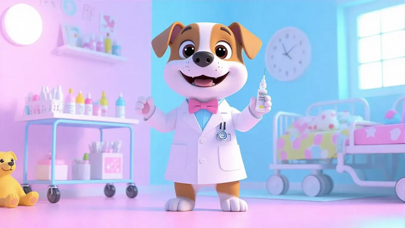 A 3D dog image wearing a smart white lab coat and a bow tie, standing upright on two legs, holding an injection with a cheerful look. Surrounded by a whimsical medical cart adorned with toys and a colorful bed, the scene exudes a bright and friendly atmosphere, with vivid lighting and playful decor.