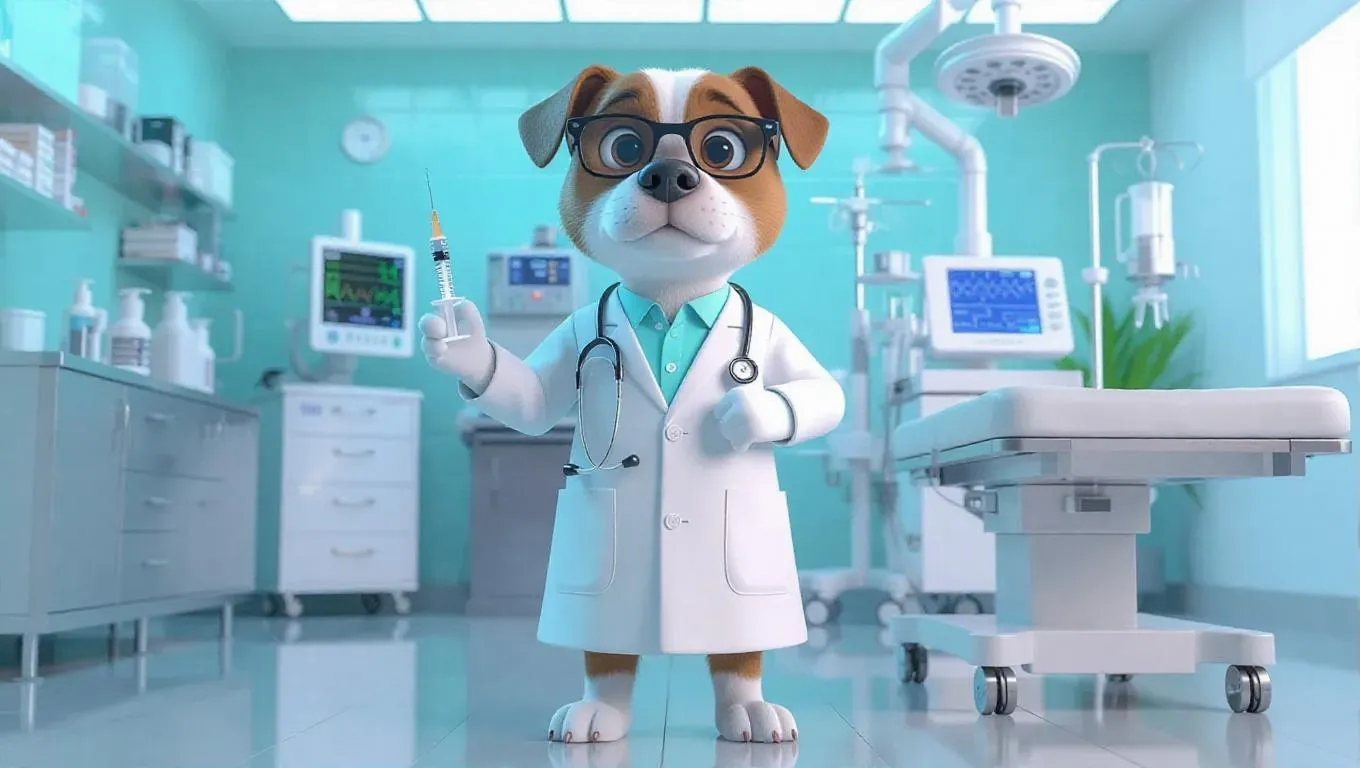 A 3D dog image wearing a white lab coat and glasses, standing upright on two legs, holding a syringe with a professional expression. Surrounded by a high-tech medical cart and a sleek examination table, the scene exudes a serious atmosphere, with cool silver lighting and modern decor.